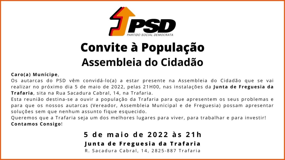 O PSD Almada dá continuidade ao ciclo de reuniões com a população em que ouviremos as questões, problemas, reclamações e sugestões de todos os munícipes. Os eleitos do PSD Almada na Vereação, Assembleia Municipal e Assembleia de Freguesia da Caparica e Trafaria querem manter a política de proximidade com os cidadãos, garantindo que nenhum assunto … Continuar a ler Continua a Assembleia do Cidadão