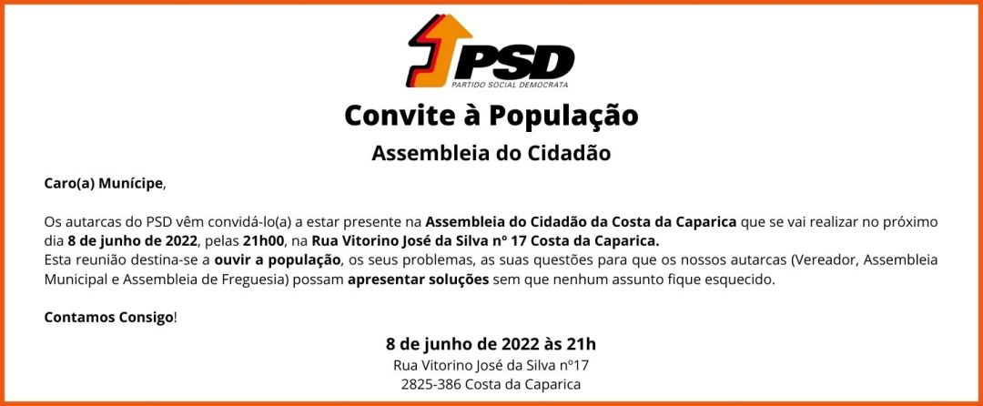O PSD Almada continua a realizar reuniões com a população para ouvir as questões, problemas, reclamações e sugestões de todos os munícipes. Os eleitos do PSD Almada na Vereação, Assembleia Municipal e Assembleia de Freguesia querem manter a política de proximidade com os cidadãos, garantindo que nenhum assunto fica esquecido. A Assembleia do Cidadão será, esta semana, na Costa da Caparica, na Rua Vitorino José … Continuar a ler Assembleia do Cidadão na Costa